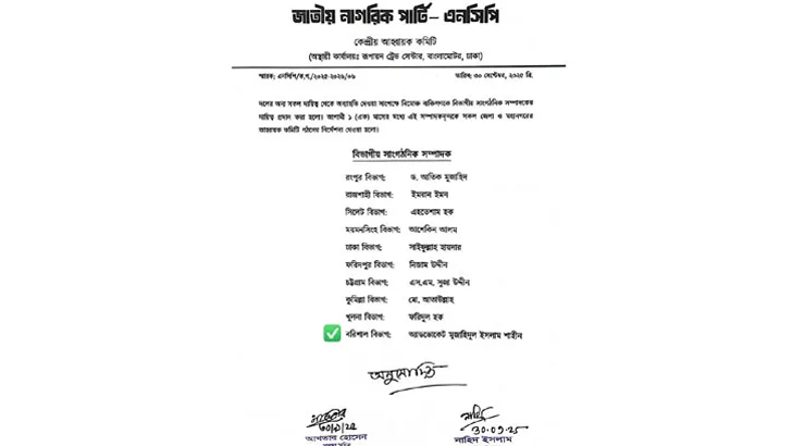 বিজ্ঞপ্তি অনুযায়ী, রংপুর বিভাগের দায়িত্ব পেয়েছেন ড. আতিক মুজাহিদ, রাজশাহীতে ইমরান ইমন, সিলেটে এহতেশাম হক, ময়মনসিংহে আশেকিন আলম, ঢাকায় সাইফুল্লাহ হায়দার, ফরিদপুরে নিজাম উদ্দীন, চট্টগ্রামে এস এম সুজা উদ্দিন, কুমিল্লায় মো. আতাউল্লাহ, খুলনায় ফরিদুল হক ও বরিশালে অ্যাডভোকেট মুজাহিদুল ইসলাম শাহীন।