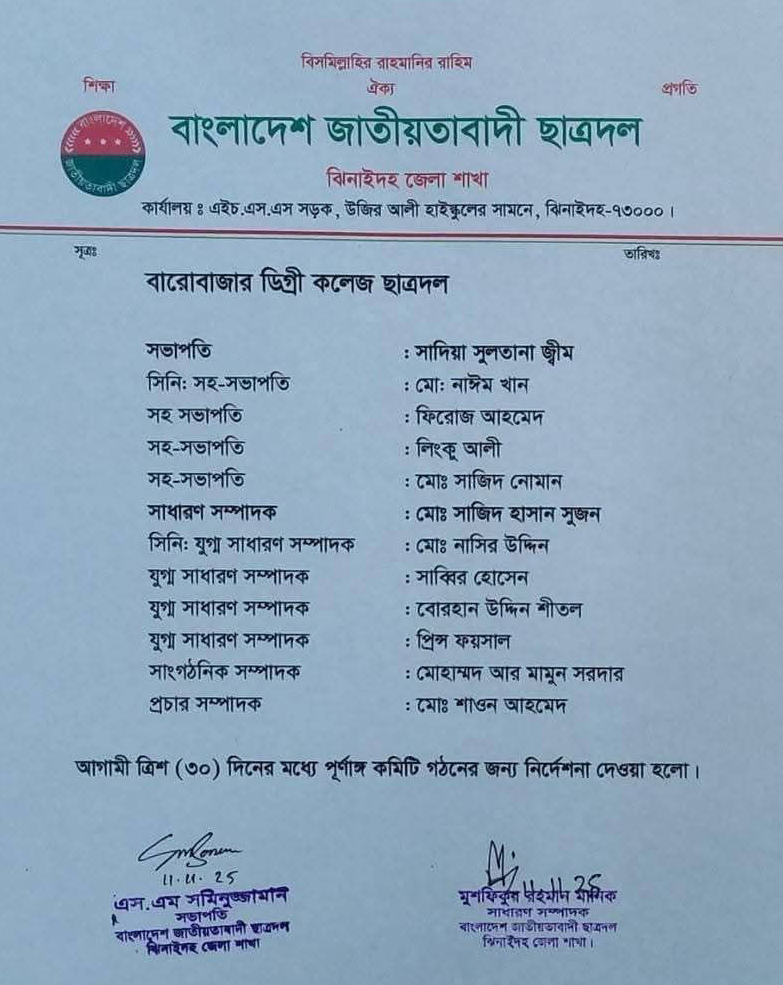 এদিকে বারবাজার ডিগ্রি কলেজ ছাত্রদলের কমিটিতে সাদিয়া সুলতানা জ্বীম ও সাজিদ হোসেন সুজনকে সাধারণ সম্পাদক ঘোষণা করা হয়েছে। এছাড়াও কমিটিতে সিনিয়র সহ-সভাপতি নাঈম খান, সিনিয়র যুগ্ম সাধারণ সম্পাদক নাসির উদ্দিন, সাংগঠনিক সম্পাদক মোহাম্মদ আর মামুন সরদার ও প্রচার সম্পাদক শাওন আহমেদ।