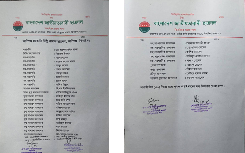 ঝিনাইদহের কালীগঞ্জ উপজেলার দুই কলেজে ছাত্রদলের কমিটি গঠন করা হয়েছে। মঙ্গলবার সন্ধ্যায় ঝিনাইদহ জেলা ছাত্রদলের সভাপতি এস এম সমিনুজ্জামান ও সাধারণ সম্পাদক মুশফিকুর রহমান মানিক স্বাক্ষরিত দলীয় প্যাডে এ কমিটি অনুমোদন করা হয়।