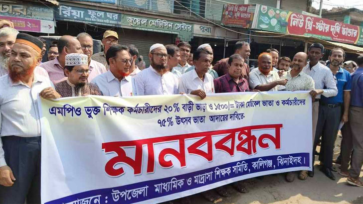 ঝিনাইদহের কালীগঞ্জে বেসরকারি শিক্ষক-কর্মচারীরা মানববন্ধন কর্মসূচি পালন করেছেন। শিক্ষকরা ২০% বাড়ি ভাড়া, ১৫০০ টাকা মেডিকেল ভাতা ও কর্মচারীদের ৭৫% উৎসব ভাতার দাবিতে এ মানববন্ধন পালন করেন।