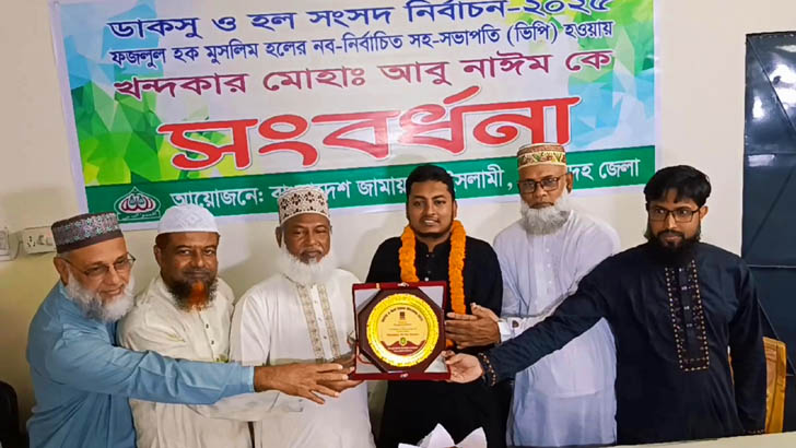 ঢাকা বিশ্ববিদ্যালয় কেন্দ্রীয় ছাত্র সংসদ (ডাকসু) নির্বাচনে ফজলুল হক মুসলিম হলের নবনির্বাচিত সহ-সভাপতি (ভিপি) খন্দকার মো. আবু নাঈমকে সংবর্ধনা দেওয়া হয়েছে। বৃহস্পতিবার সকালে ঝিনাইদহ শহরের হামদহ এলাকায় জেলা জামায়াতে ইসলামী কার্যালয়ে এই সংবর্ধনা অনুষ্ঠিত হয়।