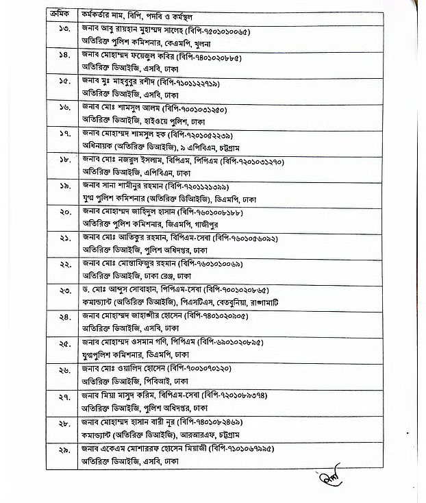 একই দিন আজ বুধবার দেশের ৬৪ জেলায় পুলিশ সুপারকে (এসপি) লটারির মাধ্যমে বদলি করা হয়। স্বরাষ্ট্র মন্ত্রণালয় (পুলিশ-১ শাখা) এই প্রজ্ঞাপন জারি করে। প্রজ্ঞাপনে বলা হয়, জনস্বার্থে জারি করা এই আদেশ অবিলম্বে কার্যকর হবে।