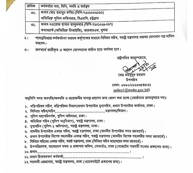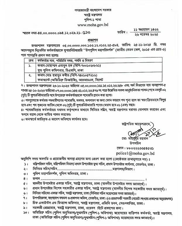রাষ্ট্রপতির আদেশক্রমে স্বরাষ্ট্র মন্ত্রণালয়ের জননিরাপত্তা বিভাগের পুলিশ-১ শাখার উপসচিব মো. মাহাবুবুর রহমান প্রজ্ঞাপন দুইটিতে স্বাক্ষর করেছেন।
