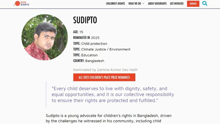 শিশুদের ‘নোবেল’ আন্তর্জাতিক শিশু শান্তি পুরস্কার–২০২৫ এর জন্য মনোনীত হয়েছেন সাতক্ষীরার তরুণ সমাজকর্মী সুদীপ্ত দেবনাথ (১৫)। তিনি শিশু সুরক্ষা, জলবায়ু ন্যায়বিচার ও শিক্ষার প্রসারে কাজের স্বীকৃতিস্বরূপ এই মনোনয়ন পেয়েছেন।