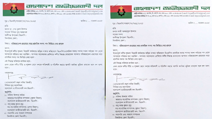 প্রেস বিজ্ঞপ্তিতে বলা হয়, ইতোপূর্বে দলীয় শৃঙ্খলা বিরোধী কর্মকাণ্ডে জড়ির থাকার অভিযোগে গত ১২ জুন এই দুই নেতাকে সাময়িকভাবে দল থেকে সাময়িক বহিষ্কার করা হয়েছিল। তাদের আবেদনের প্রেক্ষিতে দলীয় সিদ্ধান্ত মোতাবেক বহিষ্কারাদেশ প্রত্যাহার করা হলো।